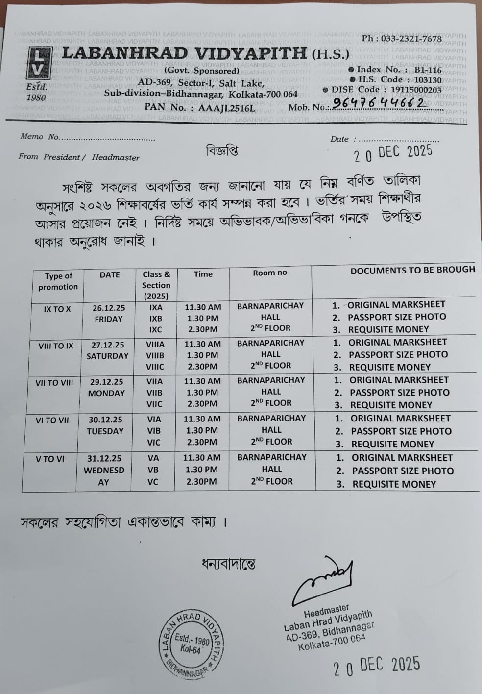 CLASS V TO X ADMISSION SCHEDULE FOR SESSION 2026.