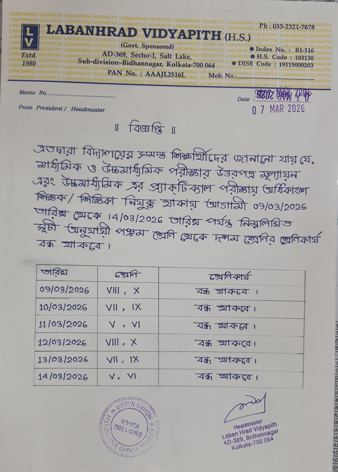 CLASSES OFF SCHEDULE FOR CLASS V TO CLASS X. CLICK FOR DETAILS.